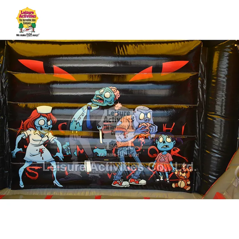 Mažos pripučiamos, šokinėjančios pilys, kuriose persekiojamos čiuožyklos: šis pripučiamas pripučiamas „Haunted Combo“ sukurtas taip, kad sužavėtų vaikus savo jaudinančia animacinių filmų ir siaubo estetika. Drąsus ryškių raudonų, blizgių juodų ir baisių žalių bei mėlynų spalvų derinys sukuria ryškią, jaudinančią aplinką. Didelė, žaisminga animacinių filmų zombių grafika dinamiškomis pozomis – pavyzdžiui, slaugytojos, smegenis valgančio veikėjo ir zombio mažylio su meškiuku – labiau smagi, nei gąsdina. Interaktyvūs elementai, tokie kaip didelis mėlynas zombis, ropojantis ant stogo, nagais besiveržiančios rankos per sienas ir grandinės / grafika ant kolonų, skatina vaizduotės žaidimą. Uždara konstrukcija su apsauginiu viršutiniu dangteliu suteikia pavėsį ir apsaugą nuo lietaus, o uždara čiuožykla papildo nuotykius. Dėl 10 pėdų aukščio jis yra universalus naudoti tiek viduje, tiek lauke, puikiai tinkantis Helovino vakarėliams, rudens festivaliams, teminiams gimtadienio renginiams ir baisiems pramogoms kieme.